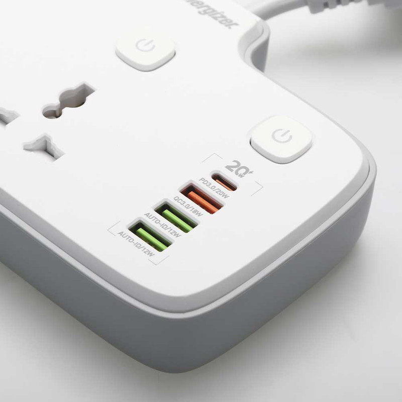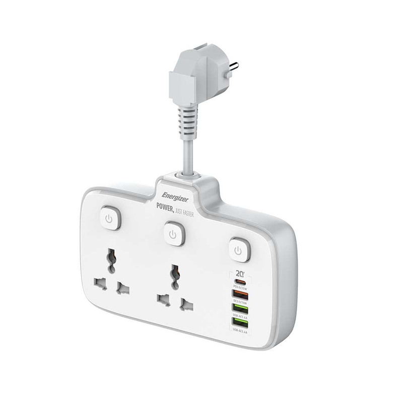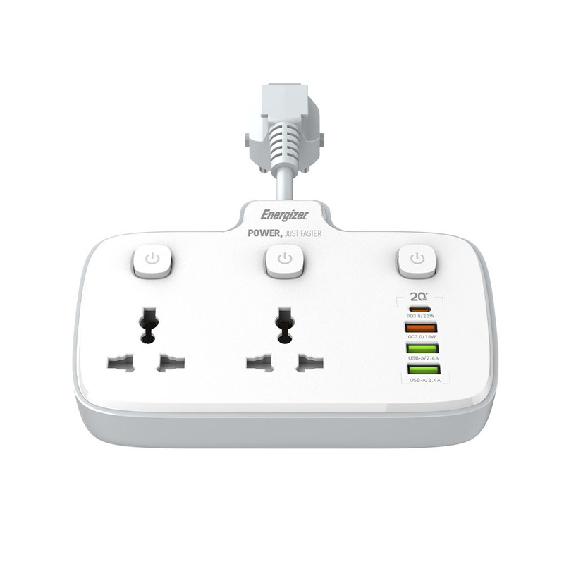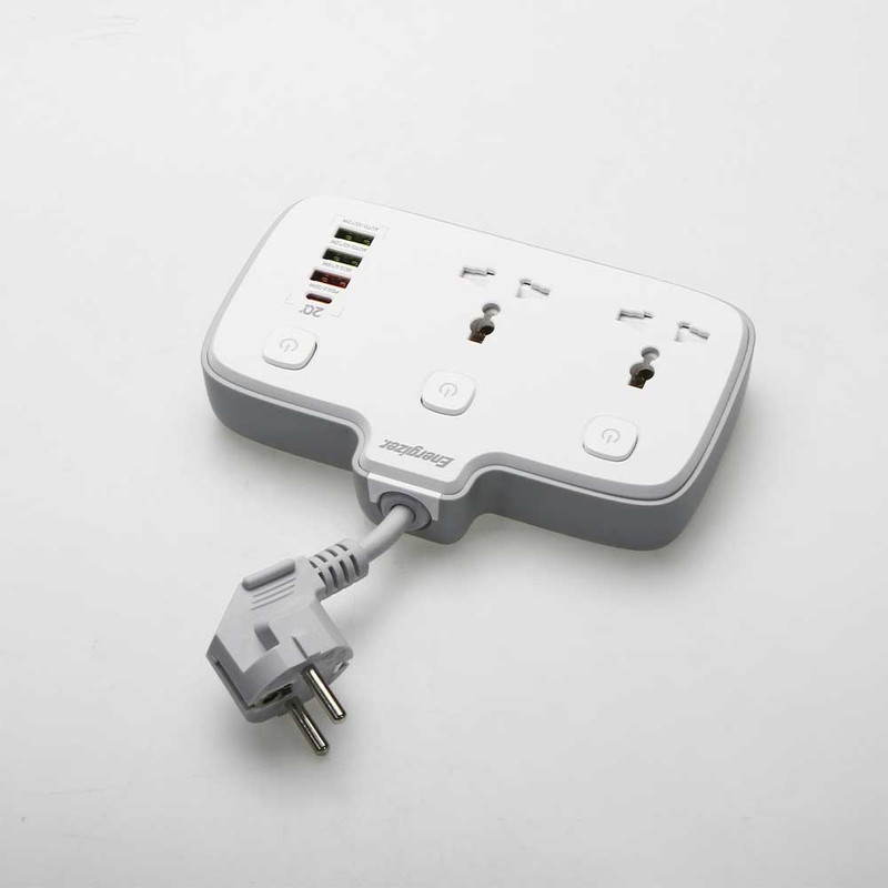 برند انرجایزر (Energizer) پس از تولید موفق کالاهای الکترونیک و ورود بازار ایران، به تولید لوازم جانبی از جمله سه راهی برق روی آورد و محصولات باکیفیت و قیمت مناسبی را روانهی بازار کرد. این چند راهی برق در ابعاد 166*111.2*33.2 میلیمتر و وزن 240.4 گرم قادر است خروجی یک پریز برق شهری را به 2 پریز یونیورسال (سه شاخه)، 3 پورت USB و 1 پورت تایپ سی (Type-C) تبدیل کند و با انواع دوشاخه یا سهشاخههای بکار رفته در نقاط مختلف جغرافیایی سازگار است. همانطور که اشاره شد چند راهی برق انرجایزر مدل EPB2503EU به پورت USB (قرمز رنگ) و تایپ سی مجهز شده است که به کمک آنها میتوان با اتصال انواع سیم شارژ یا شارژر، دستگاههای دیجیتال و موبایل را به سادگی شارژ کرد. این پورتها که از فناوری فست شارژ پشتیبانی میکنند، دارای نرخ جریان و ولتاژ زیر هستند: USB-A: 5V/3A – 9V/2A – 12V-1.5A (18W Max – QC) USB-C: 5V/3A , 9V/2.22A – 12V/1.67A (20W Max – PD) دو پورت USB (سبز رنگ) دیگر این چندراهی نیز دارای خروجی 5 ولت 2.4 آمپر است. هر یک از پورتهای یونیورسال و درگاههای شارژ دارای کلید روشن و خاموش جداگانه دارند که از مزایای این کالا به شمار میرود. همچنین 2 پریز یونیورسال (سه شاخه) نیز دارای شدت جریان خروجی 10 آمپر و حداکثر توان خروجی 2500 وات خواهد بود.