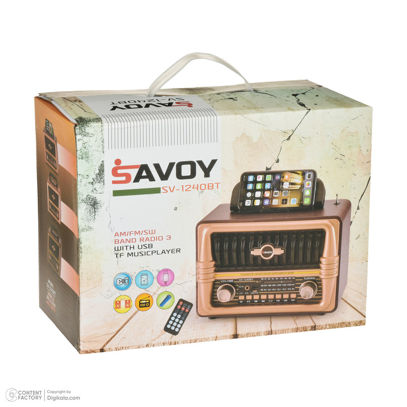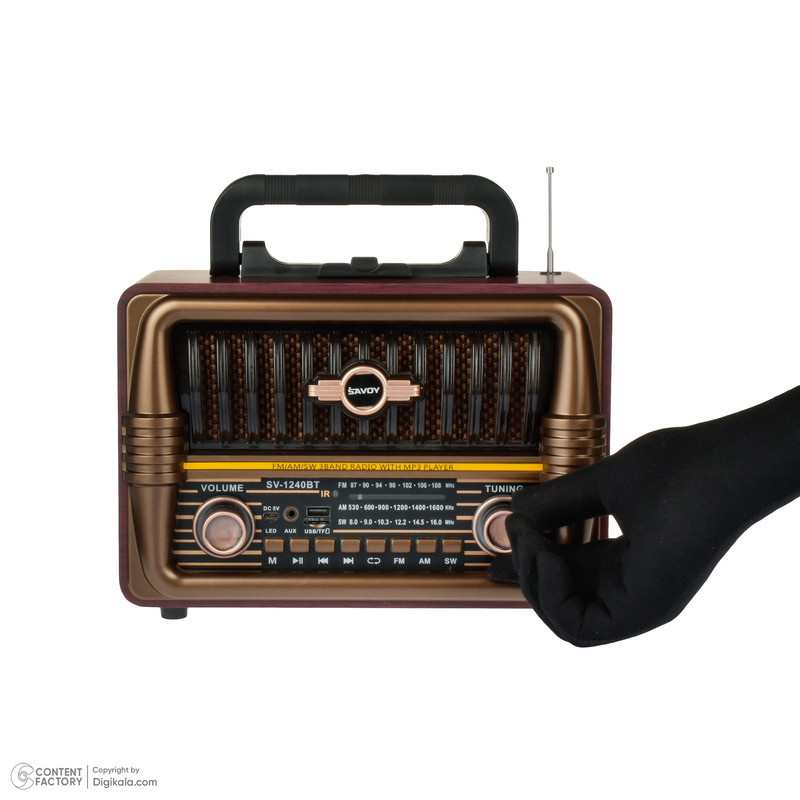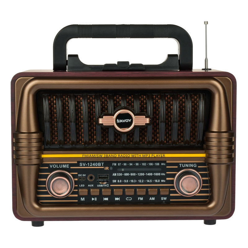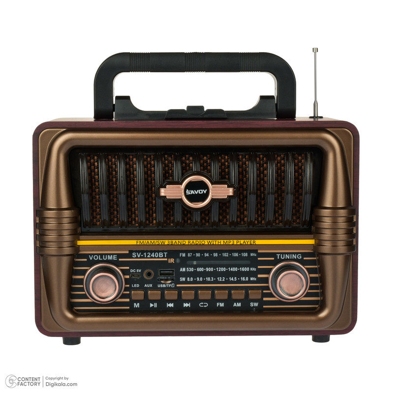 با رادیو کلاسیک ساووی مدل SV-1240BT، زیبایی و کارایی را به فضای خانه یا محل کار خود بیاورید. این دستگاه با طراحی منحصر به فرد خود، یادآور روزهای گذشته است، اما با امکانات مدرنی که دارد، پاسخگوی نیازهای امروزی شما خواهد بود.رادیو طرح قدیم ساووی مدل SV-1240BT از سه موج رادیویی AM, FM, SW پشتیبانی میکند، که به شما امکان میدهد از شنیدن انواع برنامههای رادیویی در سراسر جهان لذت ببرید. علاوه بر این، با درگاه USB و TF که در این دستگاه تعبیه شده، شما میتوانید به پخش موسیقی MP3 از طریق فلش و مموری کارت بپردازید و از مجموعه موسیقی خود به راحتی لذت ببرید. یکی از برجستهترین ویژگیهای رادیو طرح قدیم ساووی SAVOY مدل SV-1240، قابلیت اتصال بلوتوث آن است. این ویژگی به شما امکان میدهد تا به سادگی تلفن همراه یا دیگر دستگاههای خود را به رادیو متصل کرده و به محتوای صوتی مورد علاقه خود گوش دهید. علاوه بر این، دارای یک باتری شارژی با ظرفیت ۱۲۰۰ میلی آمپر است که امکان استفاده طولانی مدت و قابلیت حمل آسان را فراهم میآورد. با این باتری، دیگر نگران قطعی برق یا نیاز به پریز برق در مکانهای مختلف نخواهید بود. رادیو ساووی مدل SV-1240BT، با ترکیبی از طراحی کلاسیک و امکانات مدرن، انتخابی ایدهآل برای کسانی است که به دنبال کیفیت صدای بینظیر و ظاهری زیبا در یک دستگاه هستند. این رادیو طرح قدیم نه تنها به عنوان یک وسیله پخش موسیقی عملکردی بالا دارد بلکه به عنوان یک قطعه دکوری جذاب نیز میتواند در هر محیطی خودنمایی کند. همین حالا رادیو SAVOY ساووی مدل SV-1240BT را به مجموعه دستگاههای صوتی خود اضافه کنید و از ترکیبی منحصر به فرد از نوستالژی و فناوری مدرن لذت ببرید.